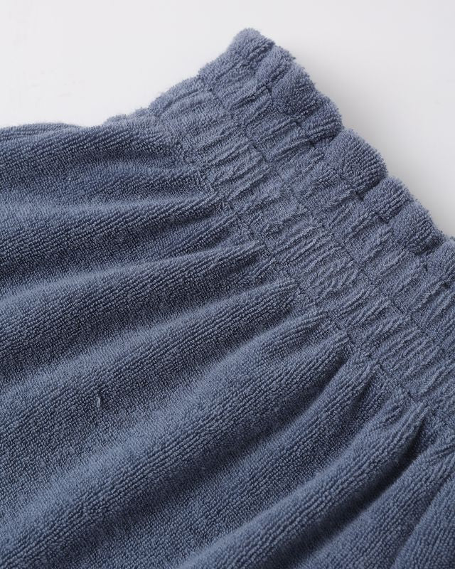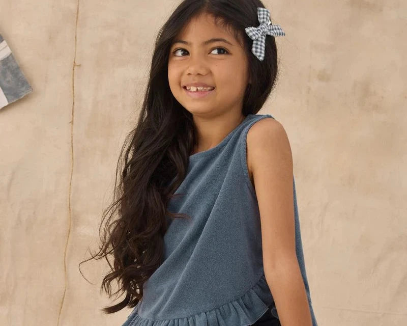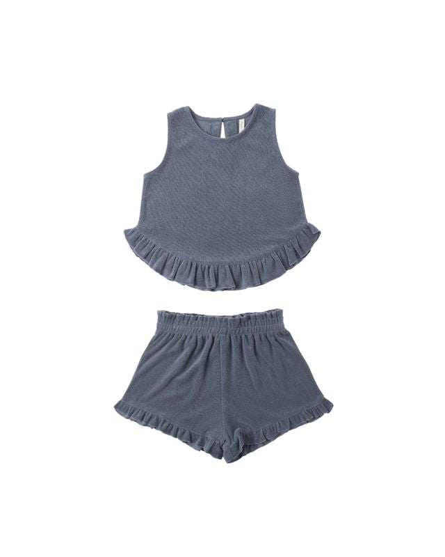 This terry cloth set features a scoop neck tank with bottom ruffle detail and matching shorts with an elastic waistband and a wide leg fit for a relaxed and breezy look.