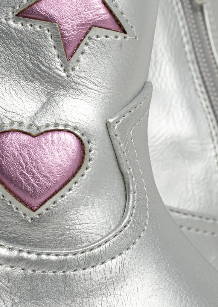 Upper: Shiny silver faux leather with pink heart and star appliqués